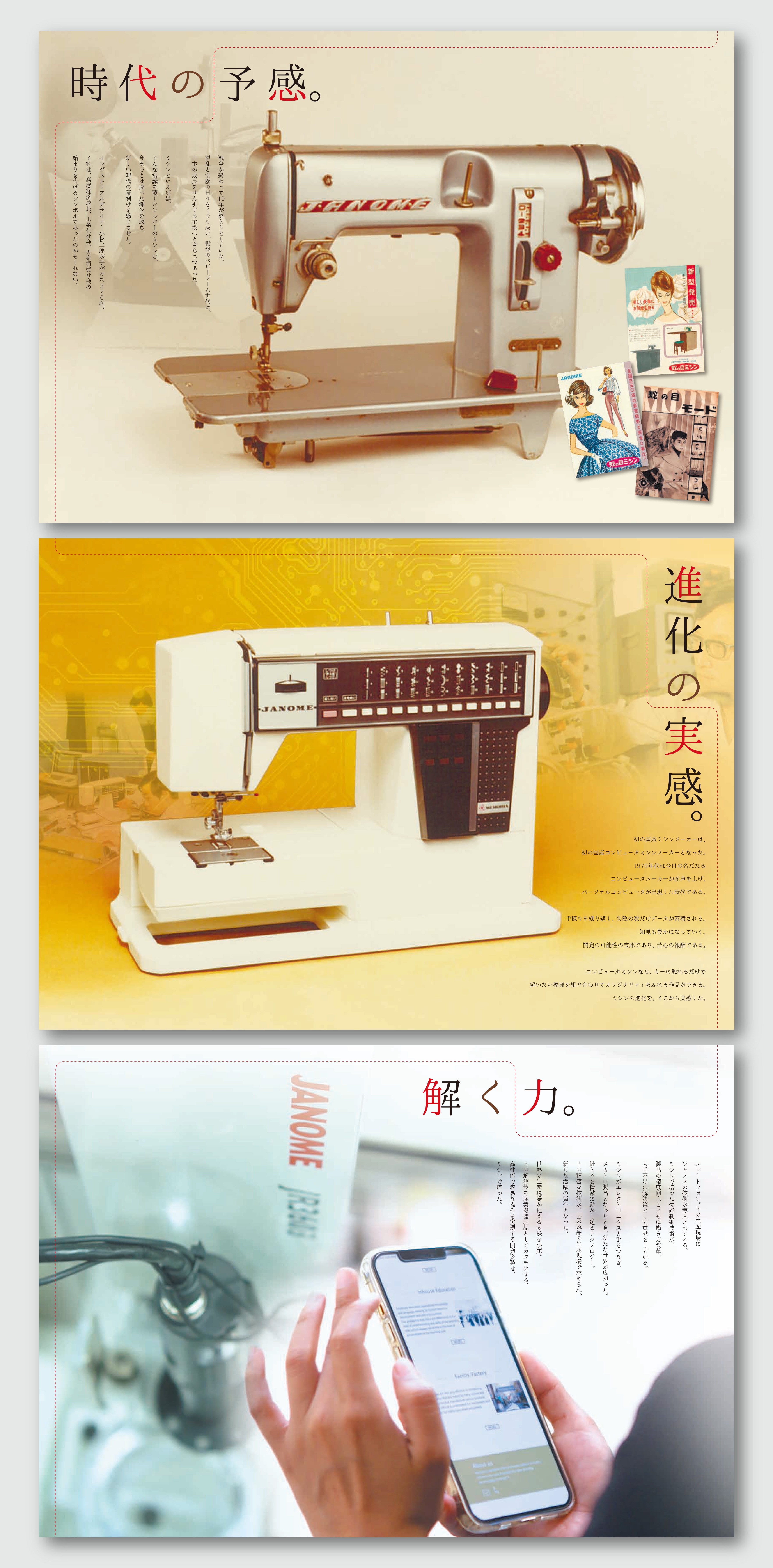 全体を通じて、「ミシン線」をデザインのキーポイントとして設定しました。表紙・イントロ・扉・本文など、各所にこの要素を取り入れることで、一貫したトーンとブランドの象徴性を持たせています。特にイントロページでは、ミシン線が繋がっていく構成とし、「過去から未来へとつながるジャノメの歩み」を象徴的に表現しました。また、本文のフォーマットには布地のテクスチャーを用い、手仕事のぬくもりやクラフト感が伝わる、温かみのあるデザインを目指しました。