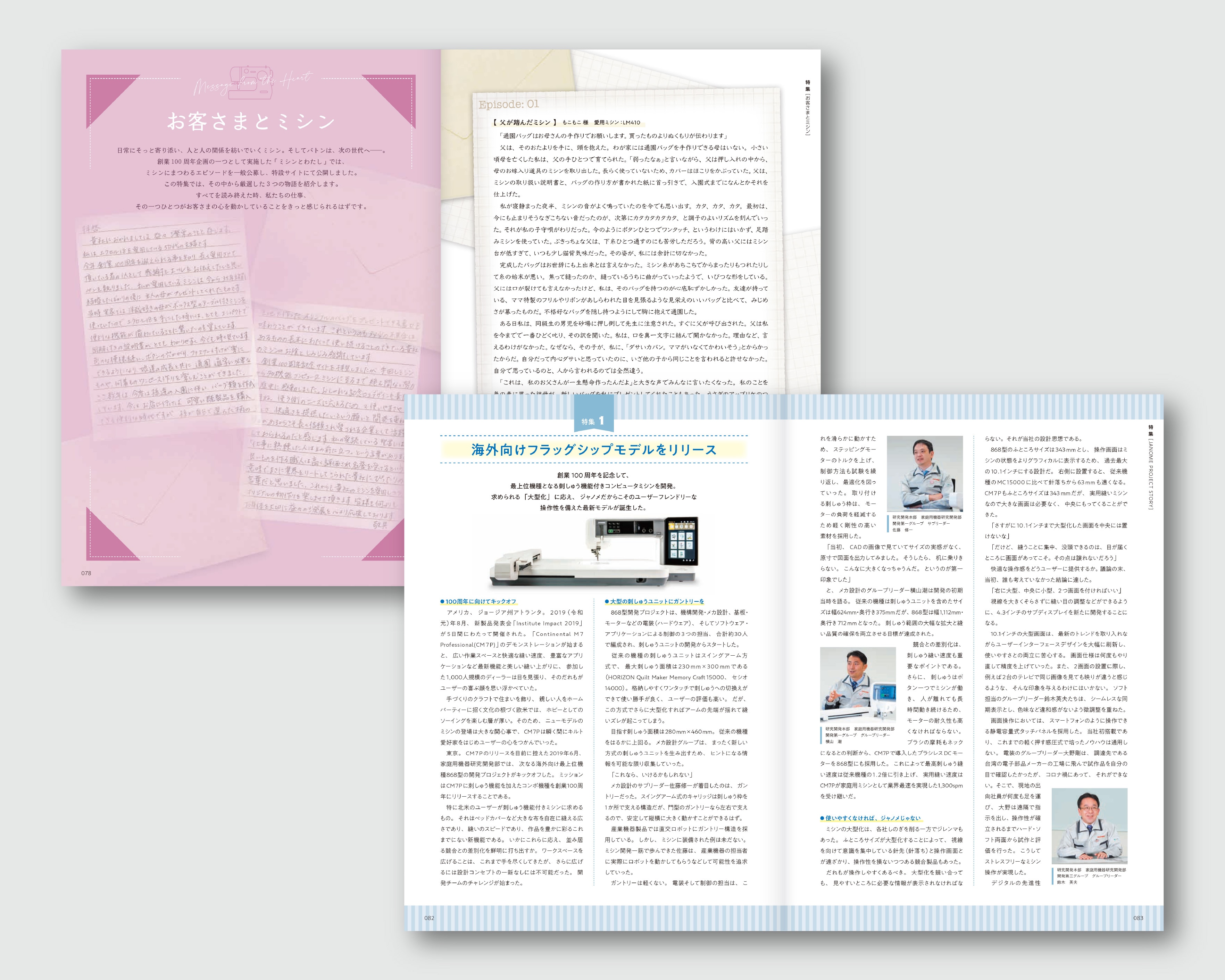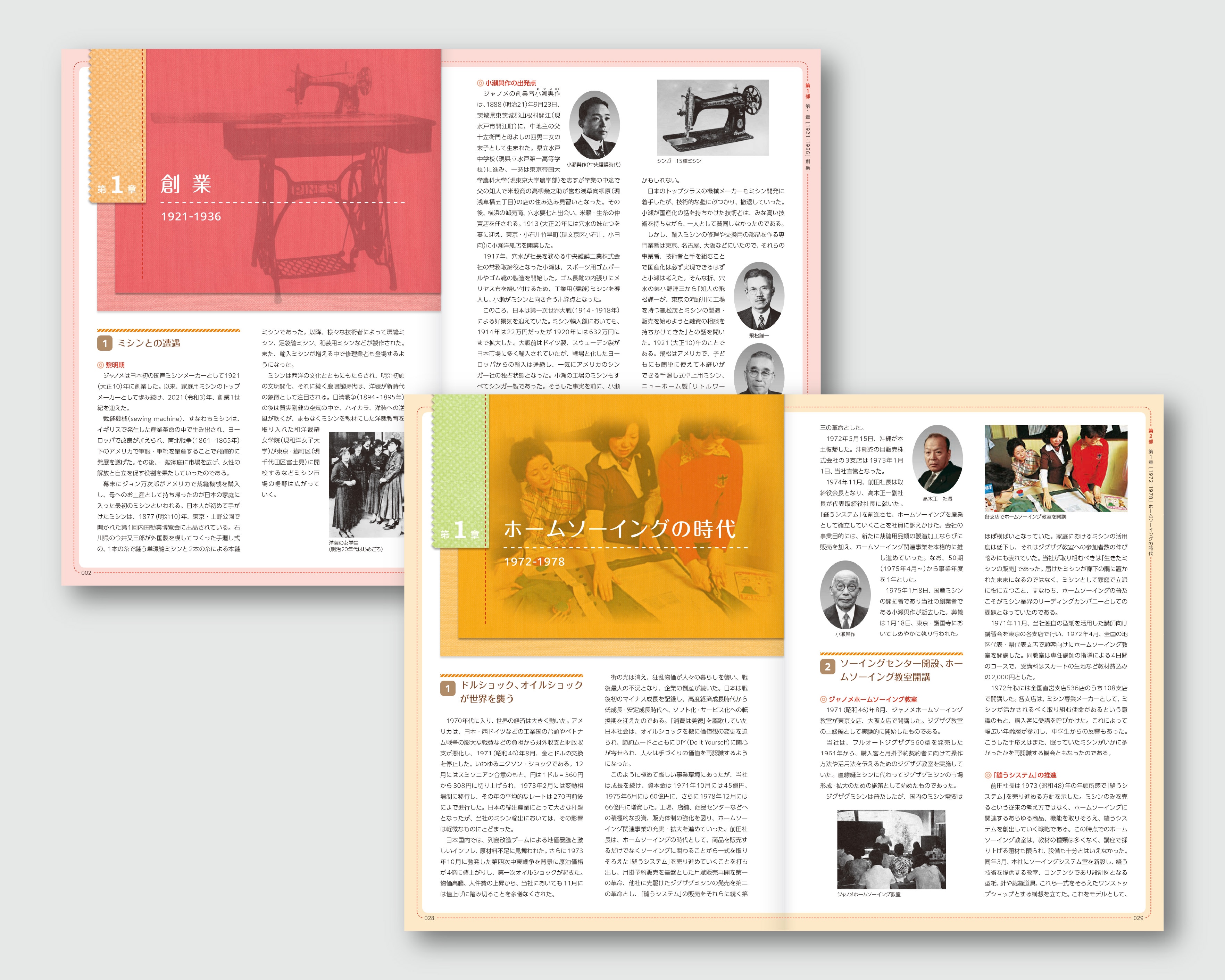 創業100周年という大きな節目に際し、周年史の制作をご依頼いただきました。デザインにおいては、柔らかさや温かみを基調としながら、ミシンが持つ独特の質感やクラフト感、手仕事のぬくもりを丁寧に表現することが求められました。あわせて、「他にはない独自性を打ち出すこと」「心が和らぐような雰囲気とともに、洗練されたブランドイメージを感じさせる仕上がりにすること」といったご要望もあり、周年という特別な節目にふさわしい一冊となるよう、トーンとビジュアル表現のバランスに細心の注意を払って設計しました。
