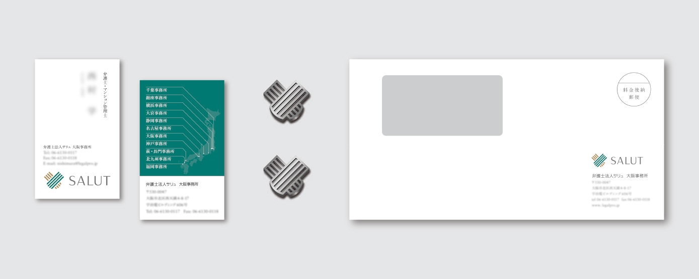 CIに基づき、弁護士法人サリュ様の法人ロゴを新たに開発しました。ロゴは、お客さまが掲げる「4つの誇り」を象徴し、2色のボーダーを重ねて構成されたX型のモチーフで表現。このクロスは、人と人とが手を取り合う姿を象徴しており、「人に寄り添うサリュの姿勢」を端的に表しています。ブランド開発においては、「サリュのブランド(らしさ)とは何か?」という根本に立ち返り、「お客様と心を一つにし、共に立ち向かう」という理念を明文化。これを将来にわたってもぶれずに伝えていくためのブランド・コミュニケーションの軸として設計しました。VI開発では、ロゴをはじめとするベーシックツール(名刺、封筒、レターヘッドなど)をトータルに設計。思想とデザインが一貫した世界観として伝わるよう、細部まで丁寧にディレクションを行いました。